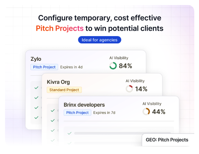 - New Business Pitches: Demonstrate GEO value with real client data during sales presentations