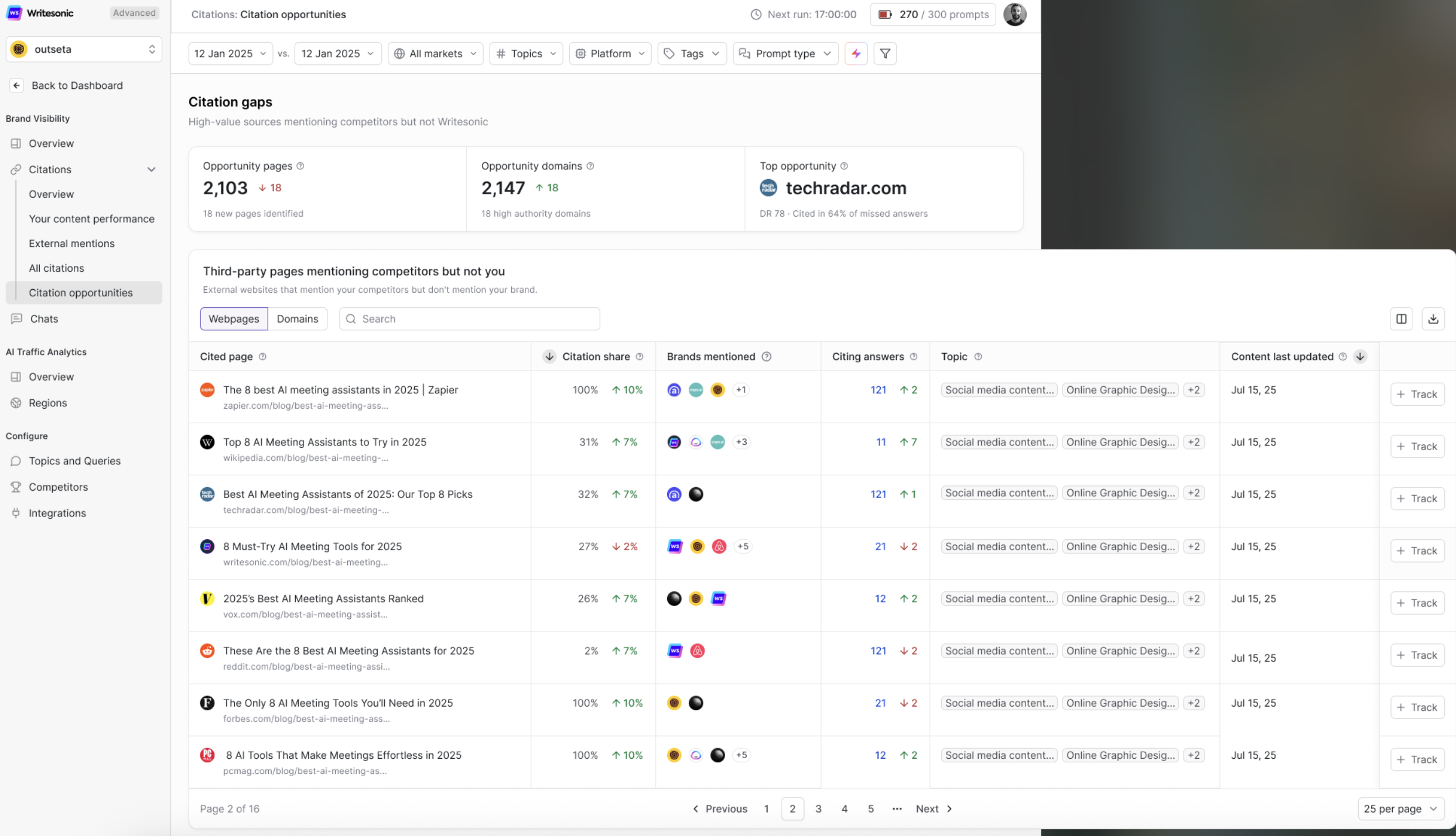 Why it matters: These three metrics give you an at-a-glance understanding of how large the gap is between your brand's current citation presence and where competitors are winning. A high number of opportunity pages means there are many places where your brand could be appearing but isn't.