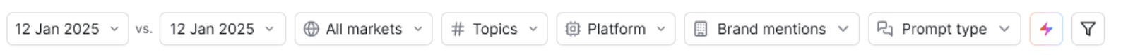 - Platform: Isolate data by AI platform (e.g., ChatGPT, Perplexity, Google AI Overviews, etc.).