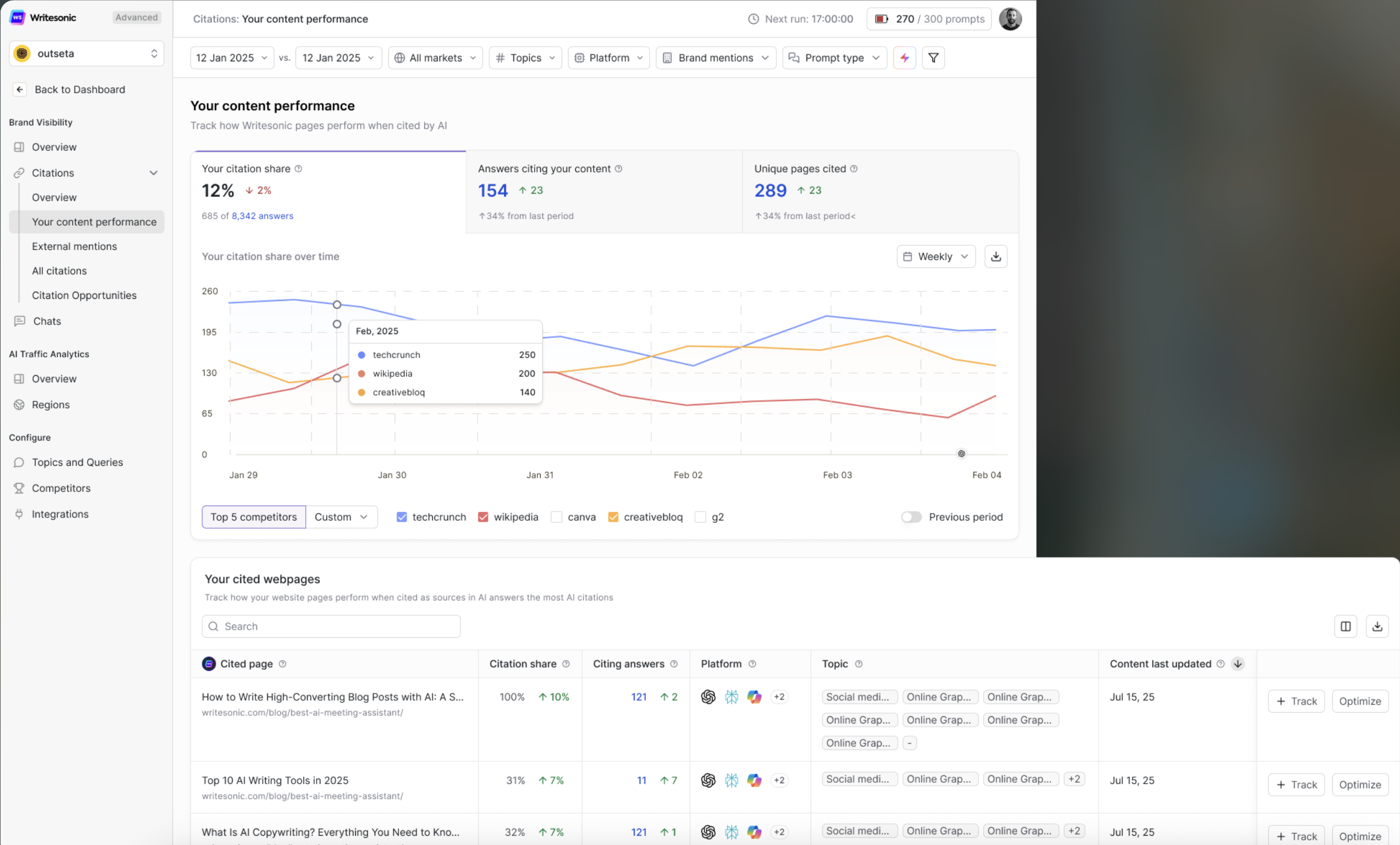 - Close competitive gaps. If competitors are dominating citation share for specific topics or prompts, analyze their cited content and create stronger, more authoritative pages to compete.