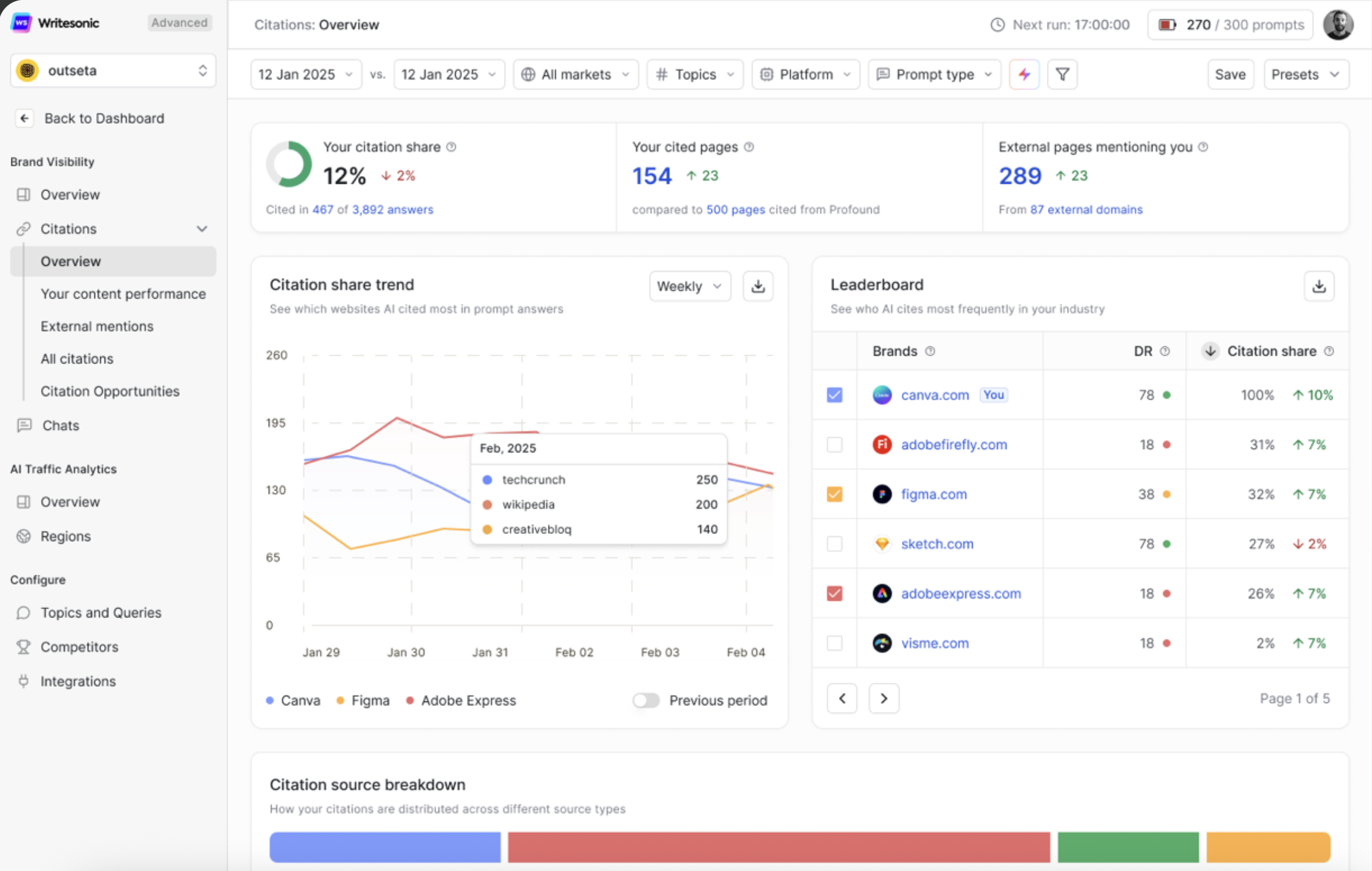 The Citations Overview page is your command center for understanding how AI search engines reference and link back to your content. It brings together everything you need — citation volume, source authority, competitive gaps, and content performance — in a single, actionable view.