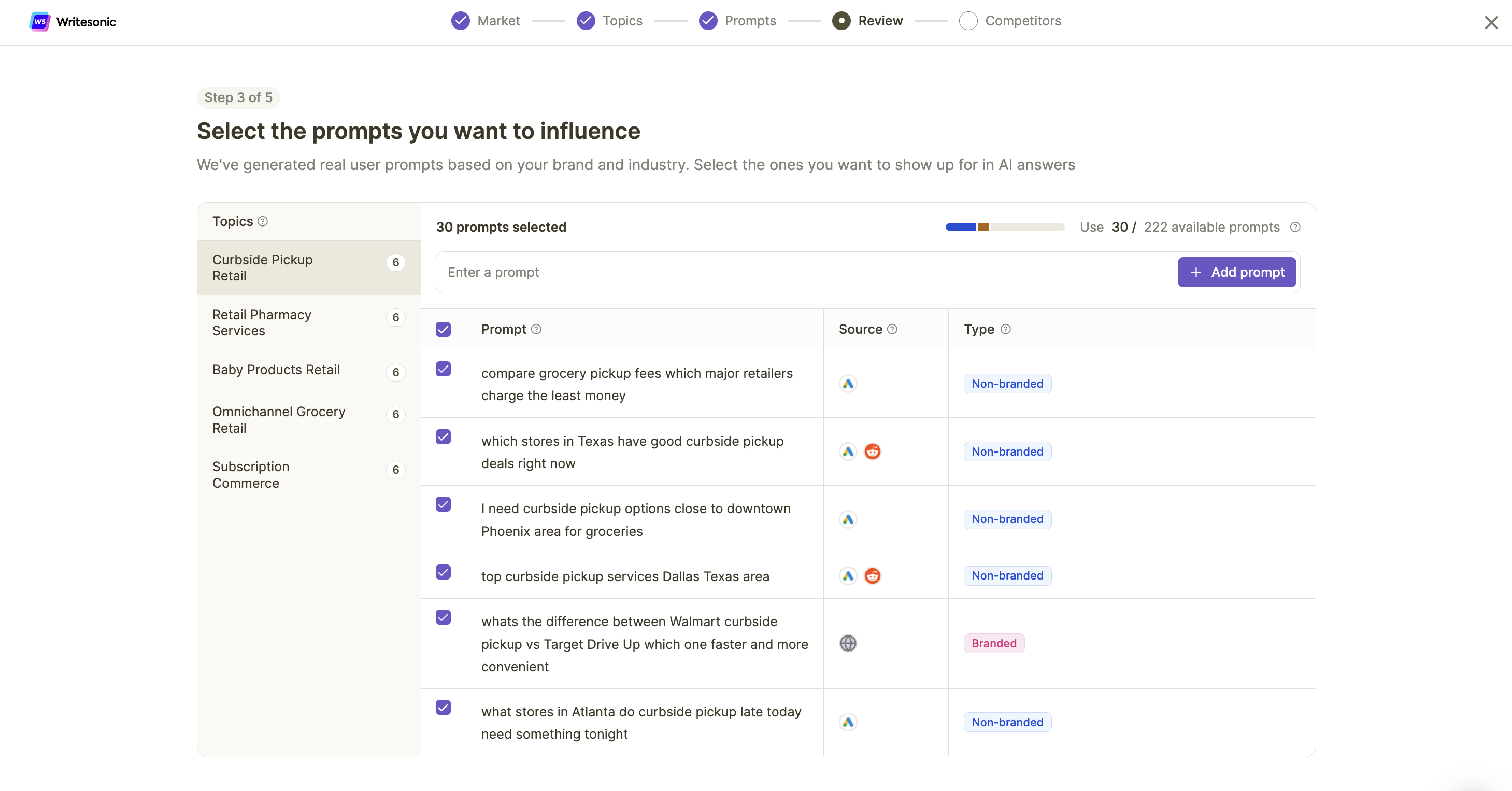 After you’ve selected the required prompts, the next step is adding your competitors.