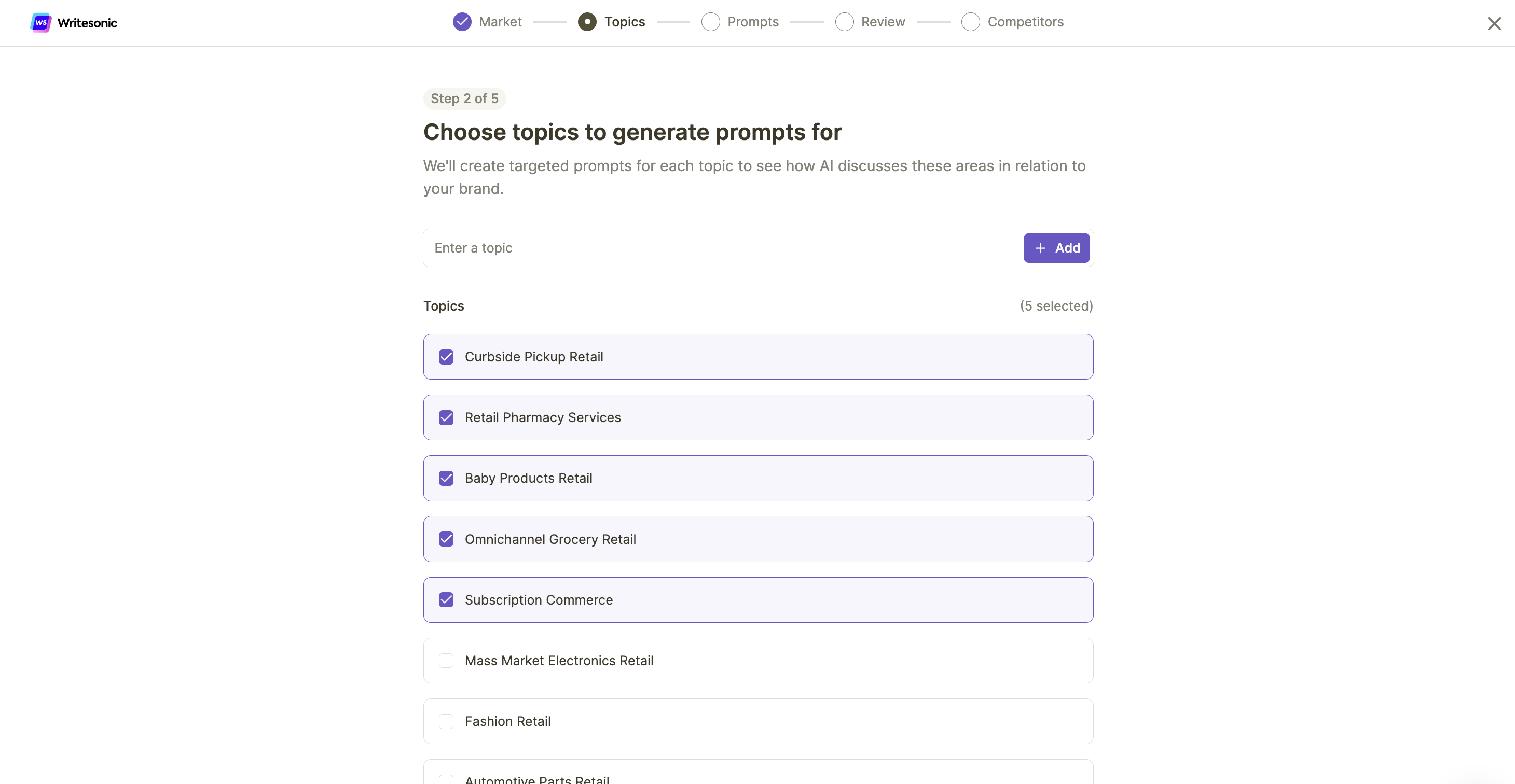 You’ll be asked to choose 2 to 10 topics that best describe what you do or what categories you want to compete in. These topics are also later used to craft prompts that you need to track for your business.