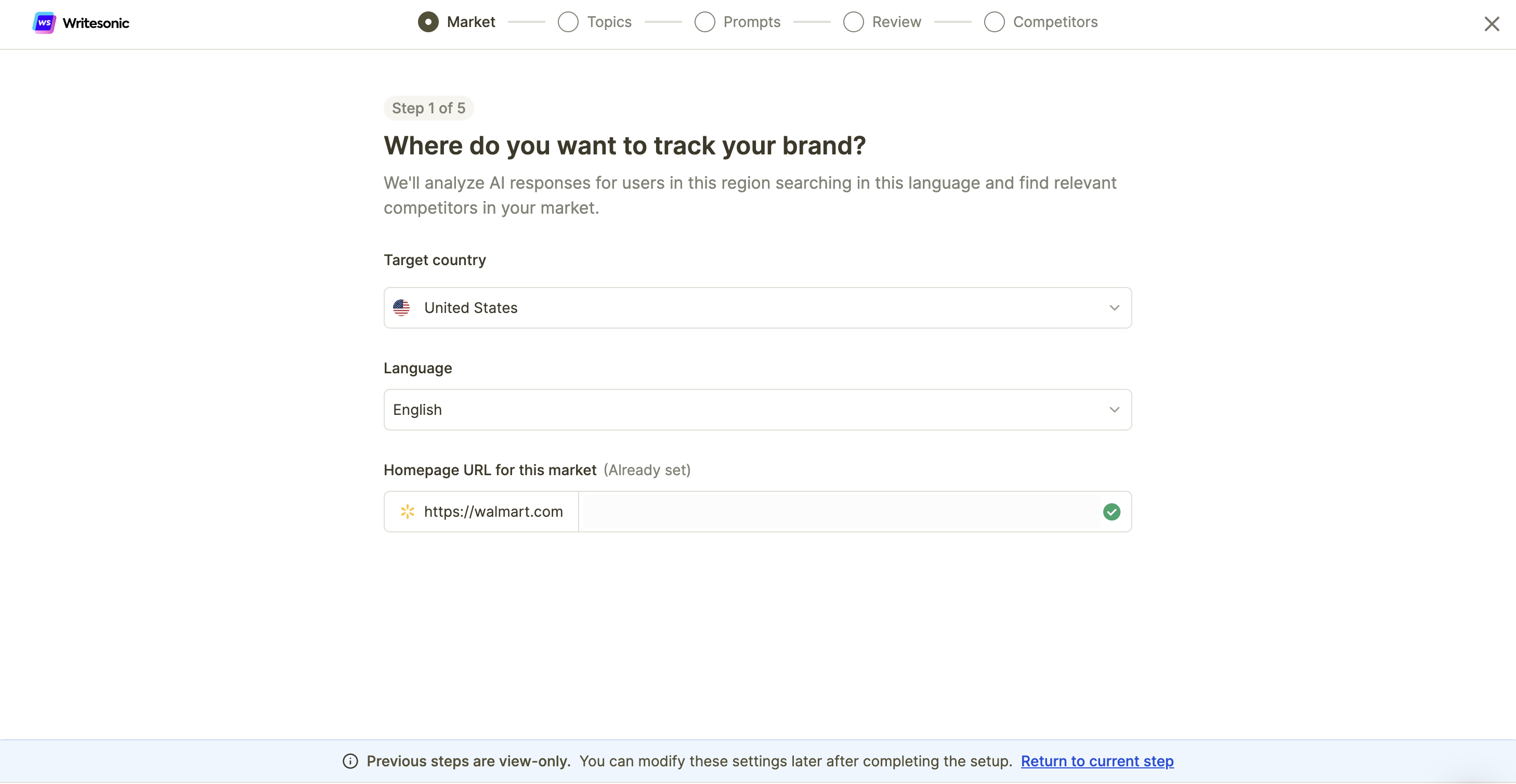 Target country: Select the geographic region you want to monitor from the dropdown (e.g., India, United States, Canada, United Kingdom) Note: Some AI platforms may have limited availability in certain regions. You'll see a warning indicator if this applies to your selected country. Language: Choose the language for AI visibility tracking (e.g., English, Spanish, French, German) Homepage URL: for this market (Optional): If you have a region-specific domain or subdomain, enter it here (e.g., https://cardekho.com for India, ca.yoursite.com for Canada). This field shows "(Already set)" if you've previously configured a homepage URL during initial setup.