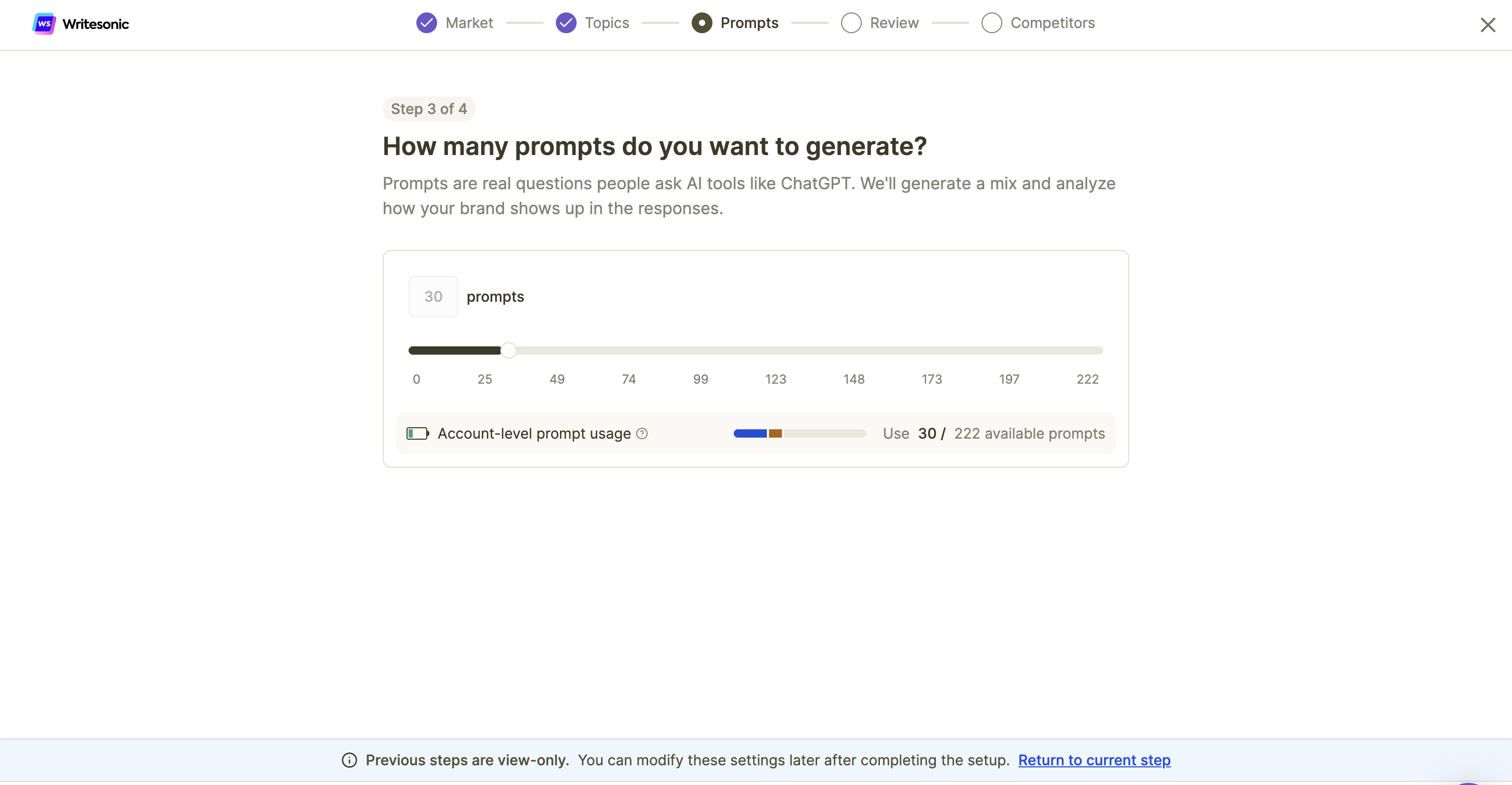 How to add prompts Automatic topic-based generation (recommended) During the project setup flow (Step 3 of 4), you'll see the "How many prompts do you want to generate?" screen: