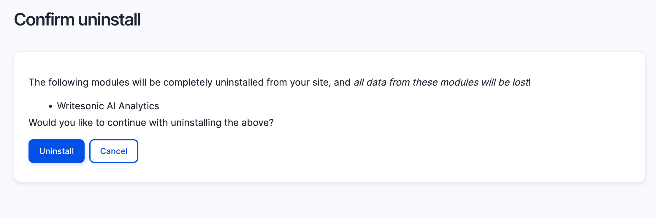 drush pmu writesonic_ai_analytics- To completely remove the writesonic_ai_analytics module and it’s files from your drupal project, you can run