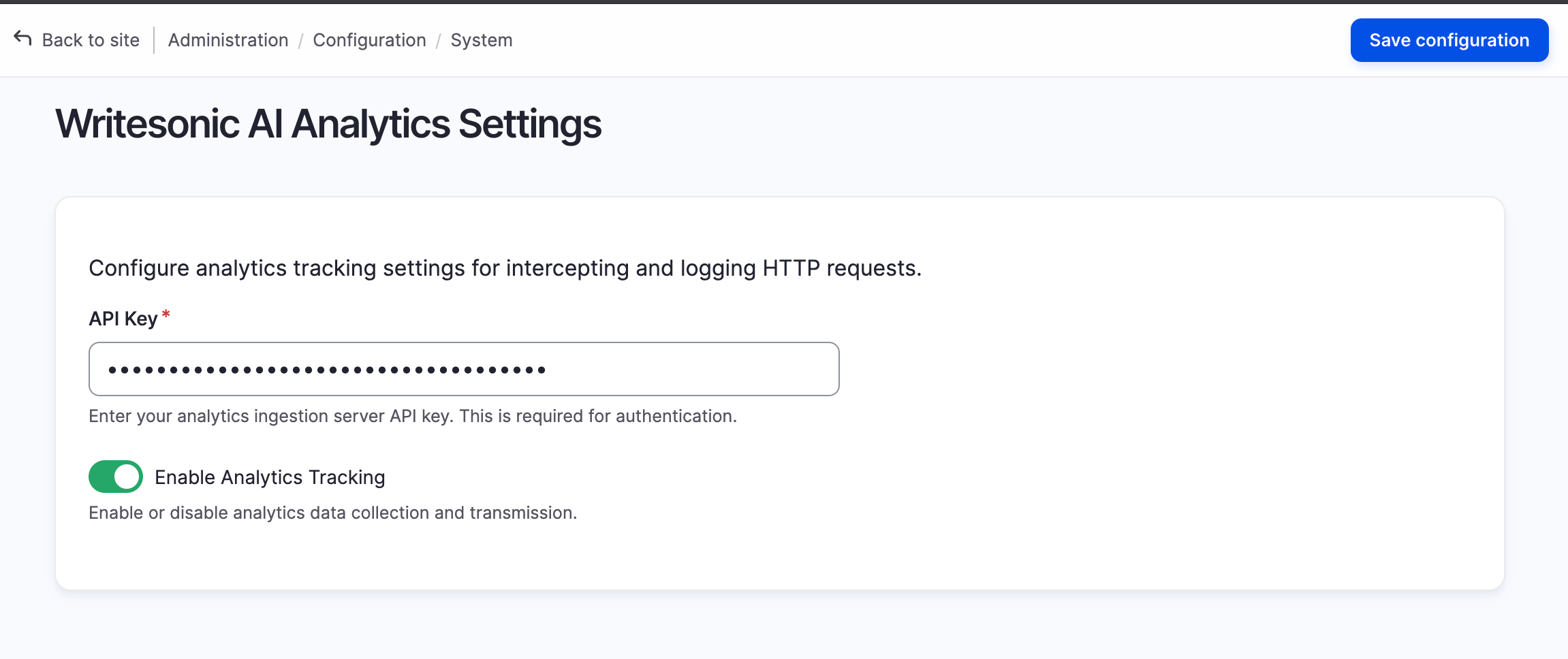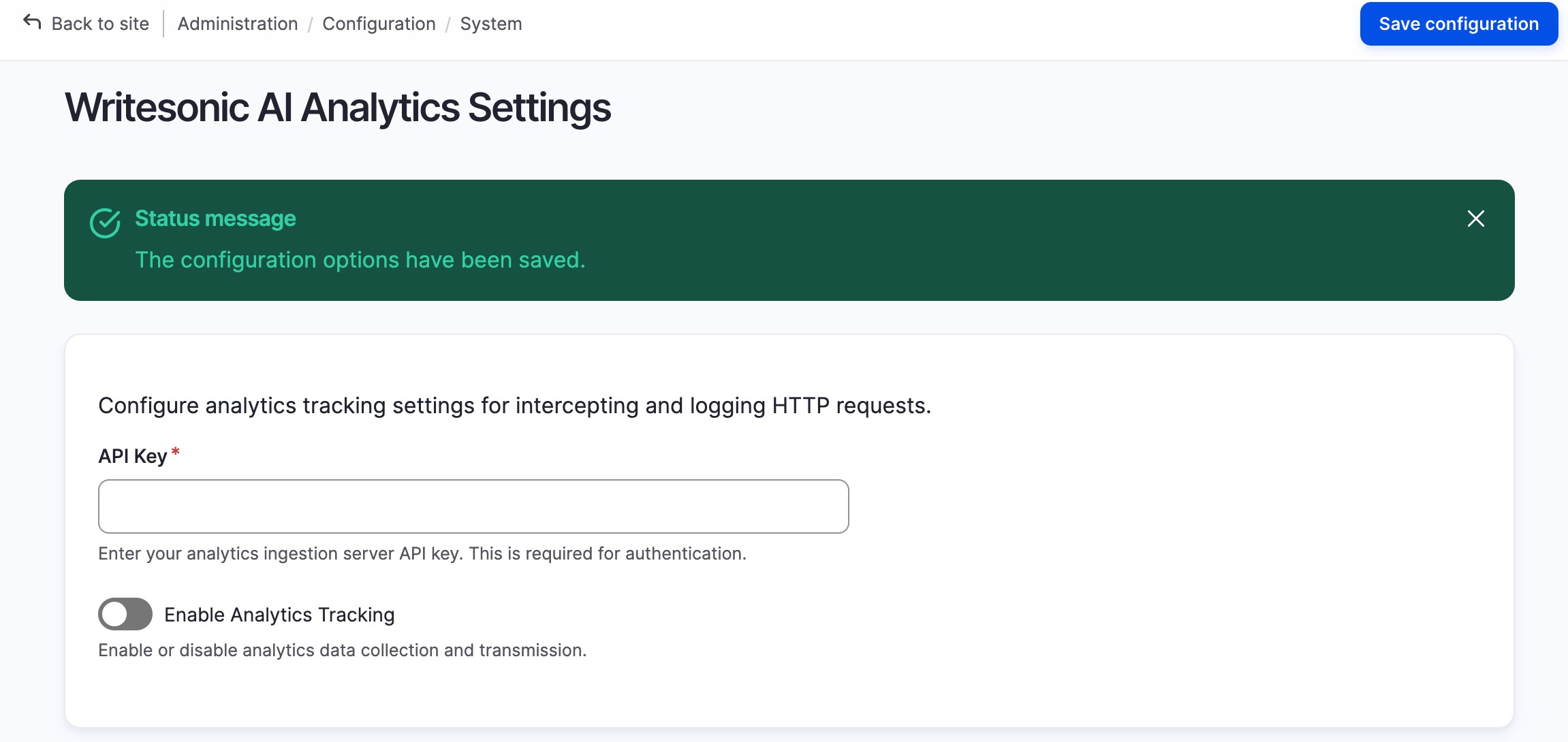 - Navigate to Configuration > System > Writesonic AI Analytics Settings in your Drupal admin panel