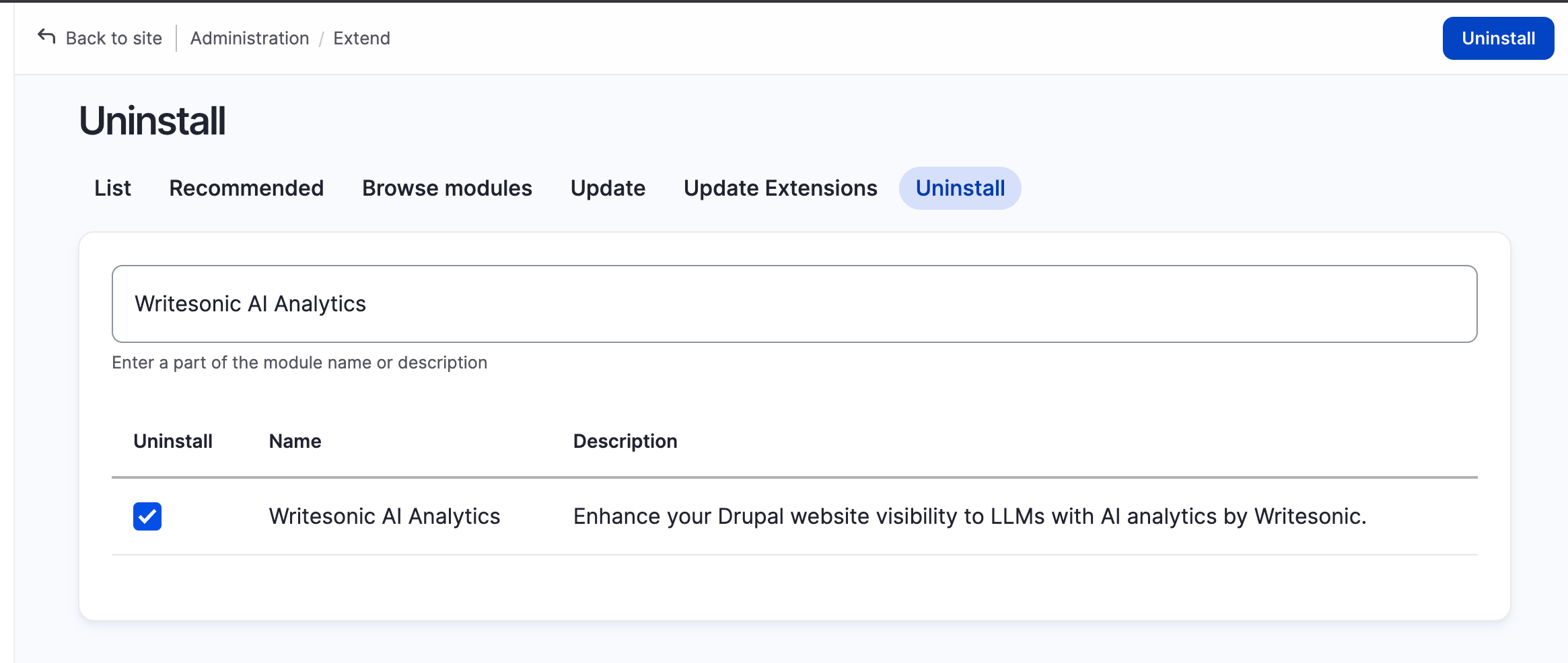 - If you want to completely uninstall the module, you can navigate to Extend in your Drupal admin panel