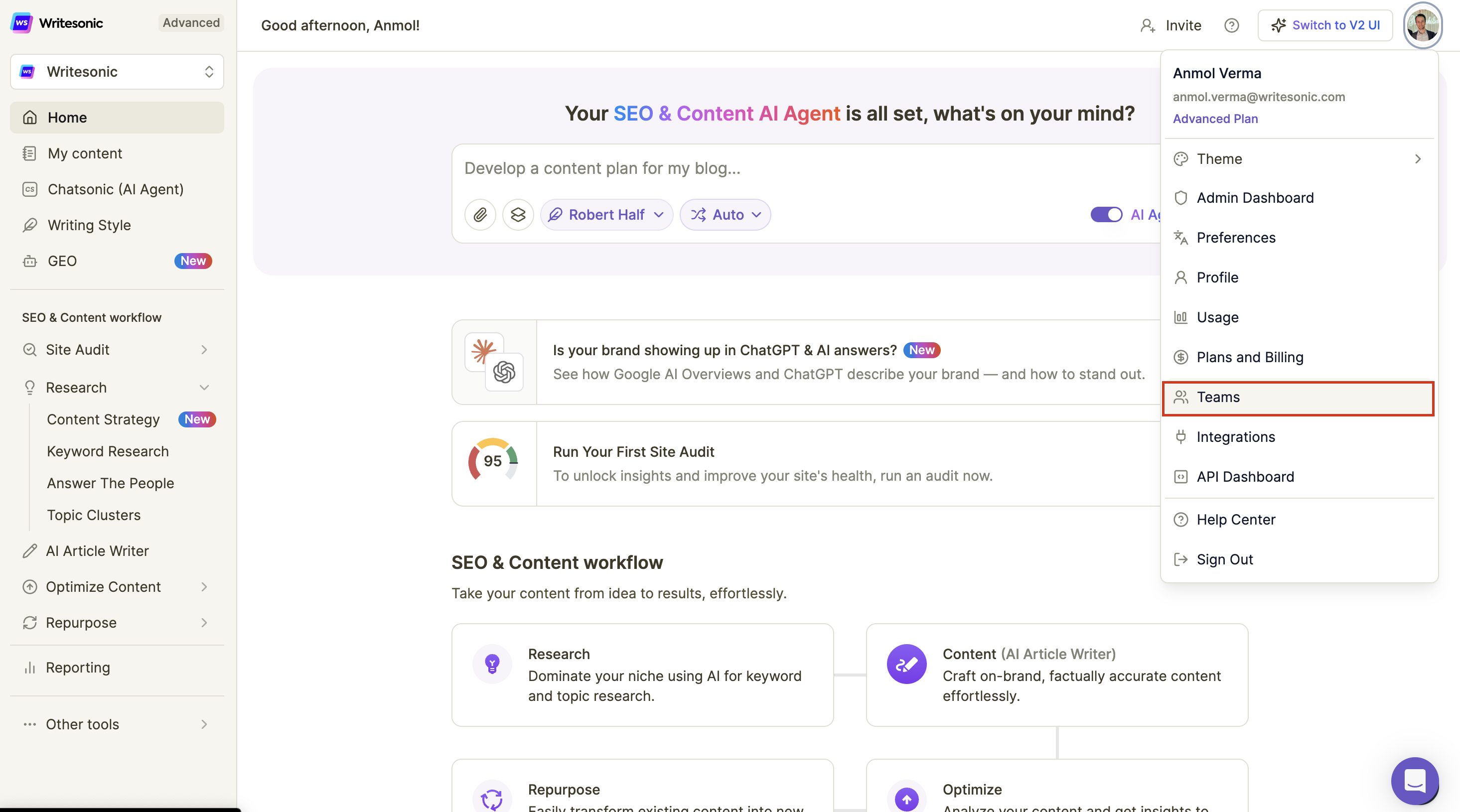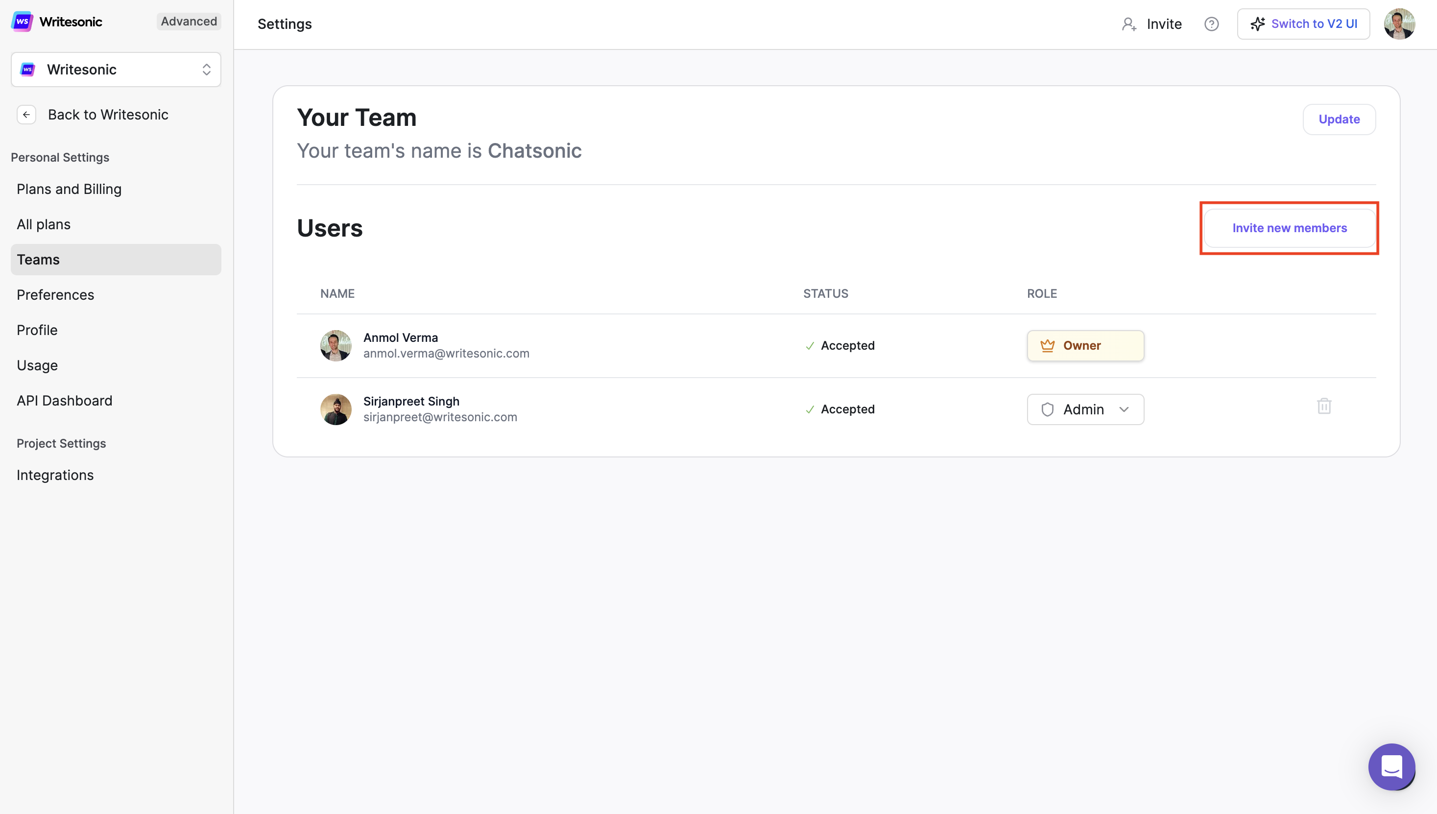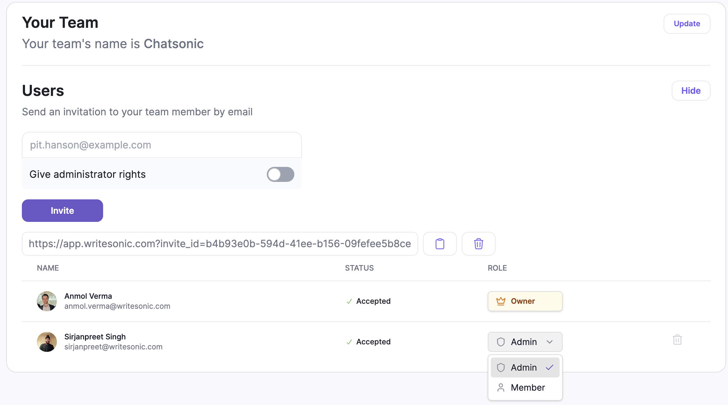 - Change team member's role - click the dropdown next to the team member's name and select a role (admin or member)
