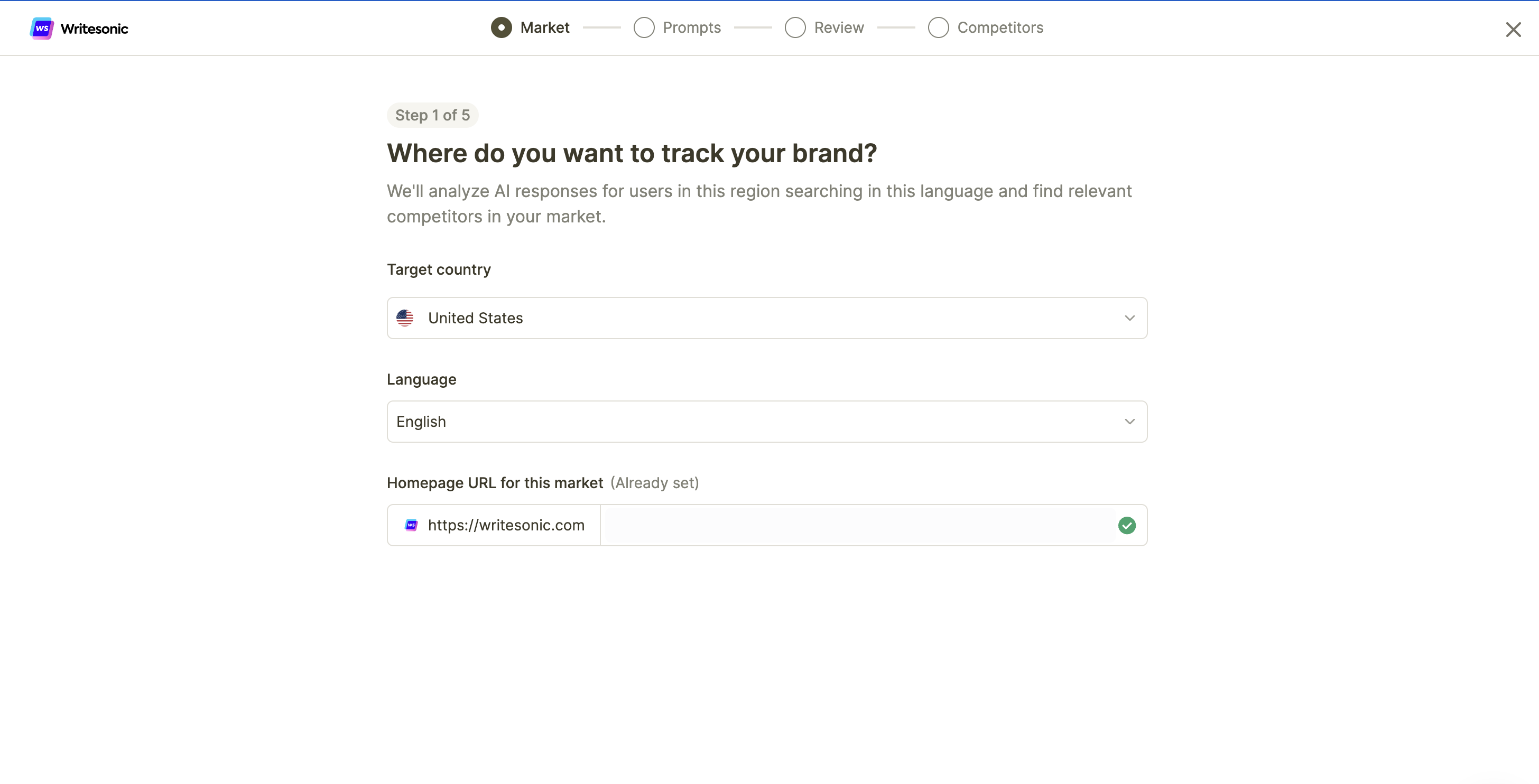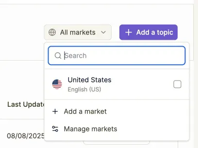 A: A Market is a specific combination of one country and one language that you want to monitor for AI visibility. For example, “United States - English” is one market, while “United States - Spanish” would be a separate market.