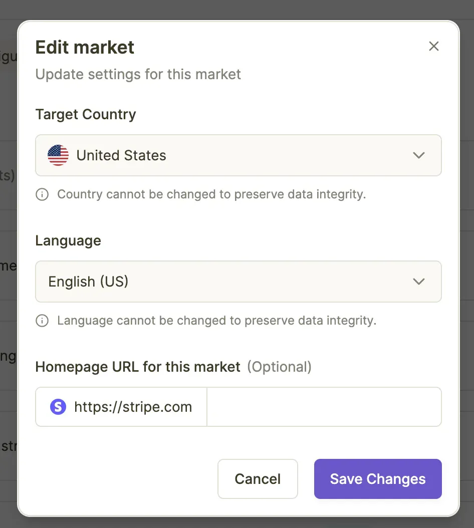 Note: Country and language selections cannot be changed after market creation to preserve data integrity and historical tracking consistency.