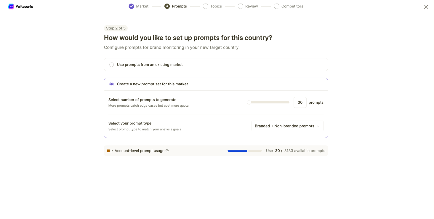 A: Prompts are counted independently for each market. If you use 30 prompts in Market A and the same 30 prompts in Market B, it counts as 60 prompts total against your quota.
