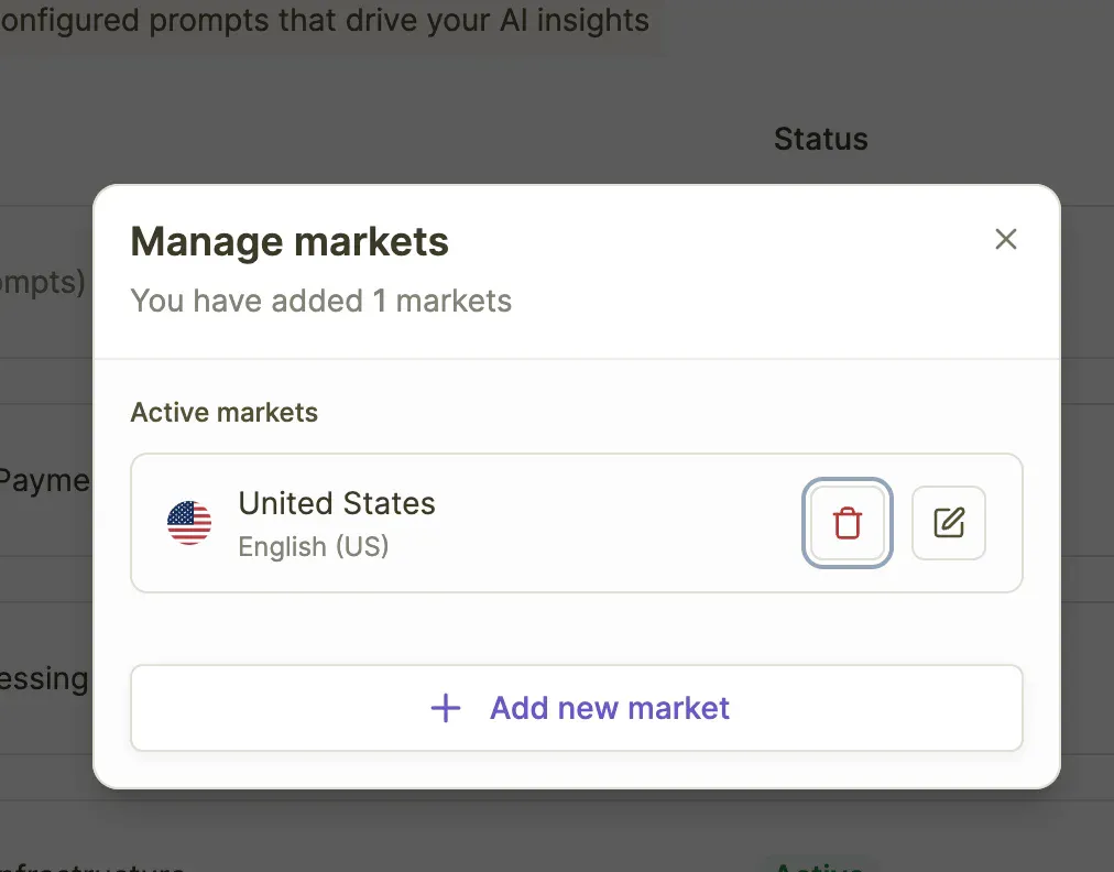 Each market represents a unique combination of one country and one language, giving you granular control over your global AI presence monitoring.