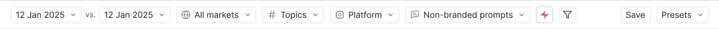 - Topics — Narrow the dashboard to one or more specific topics you've configured. Helps you evaluate AI visibility per product line, category, or business unit.