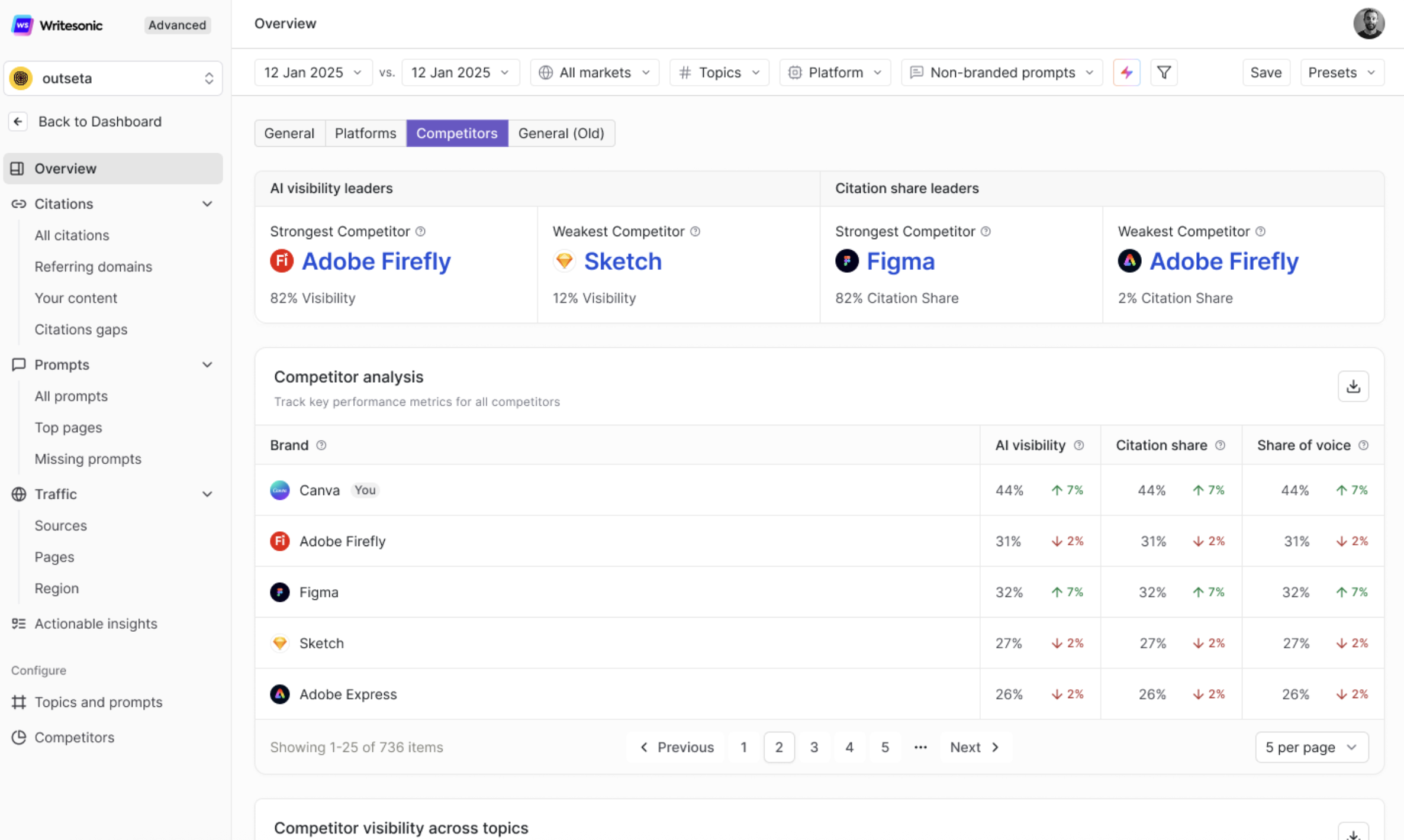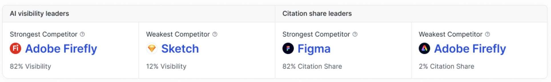 These four data points establish the boundaries of your competitive landscape. The strongest competitors set the benchmark for what's achievable in your space, while the weakest reveal the floor. Use this to calibrate your own goals — if the top competitor holds high visibility, that's your target. If the weakest competitor's citation share is low, make sure you're not trending in the same direction.