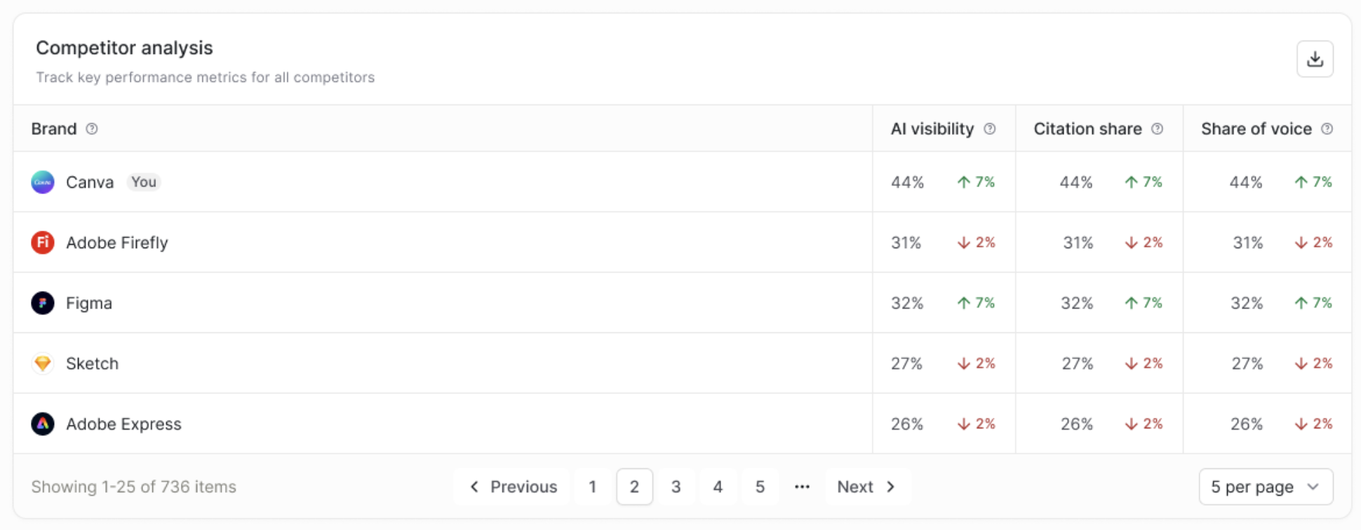 - Rows represent each tracked competitor (including your brand)