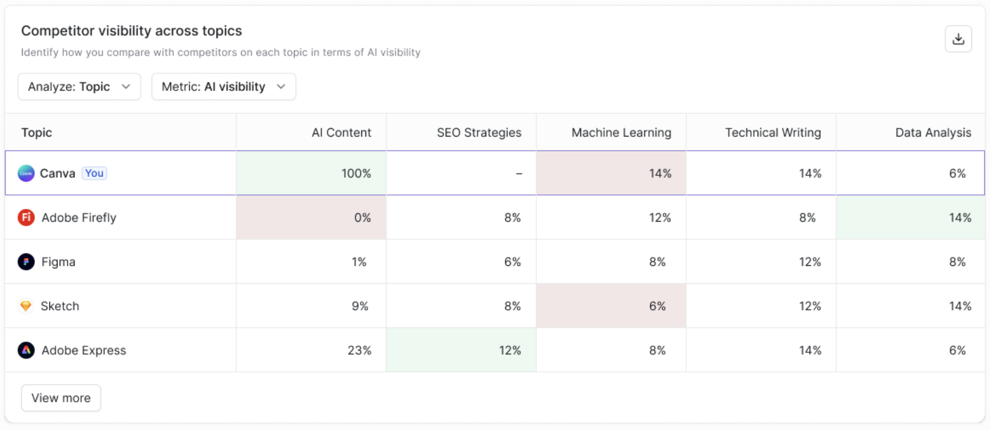 - Spot momentum shifts. A competitor with rapidly rising AI visibility may be executing a new content strategy worth investigating.