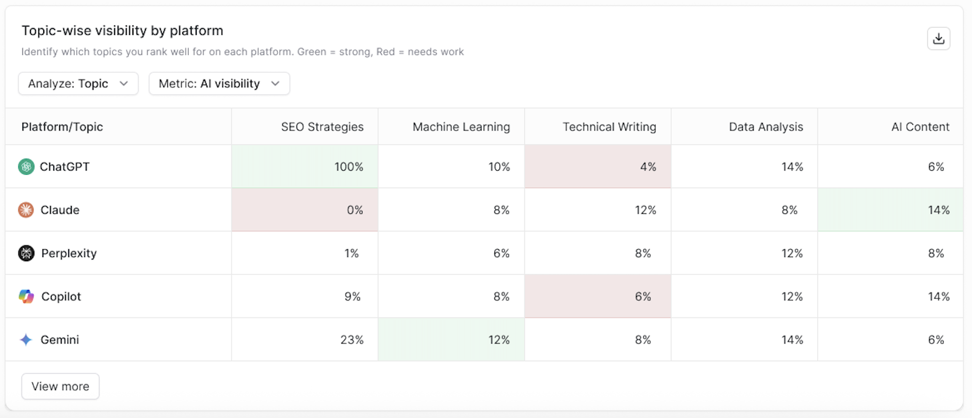 - Leverage the topic-platform heatmap for content planning. Red cells in the heatmap are your roadmap. Build or optimize content specifically for those topic-platform gaps.