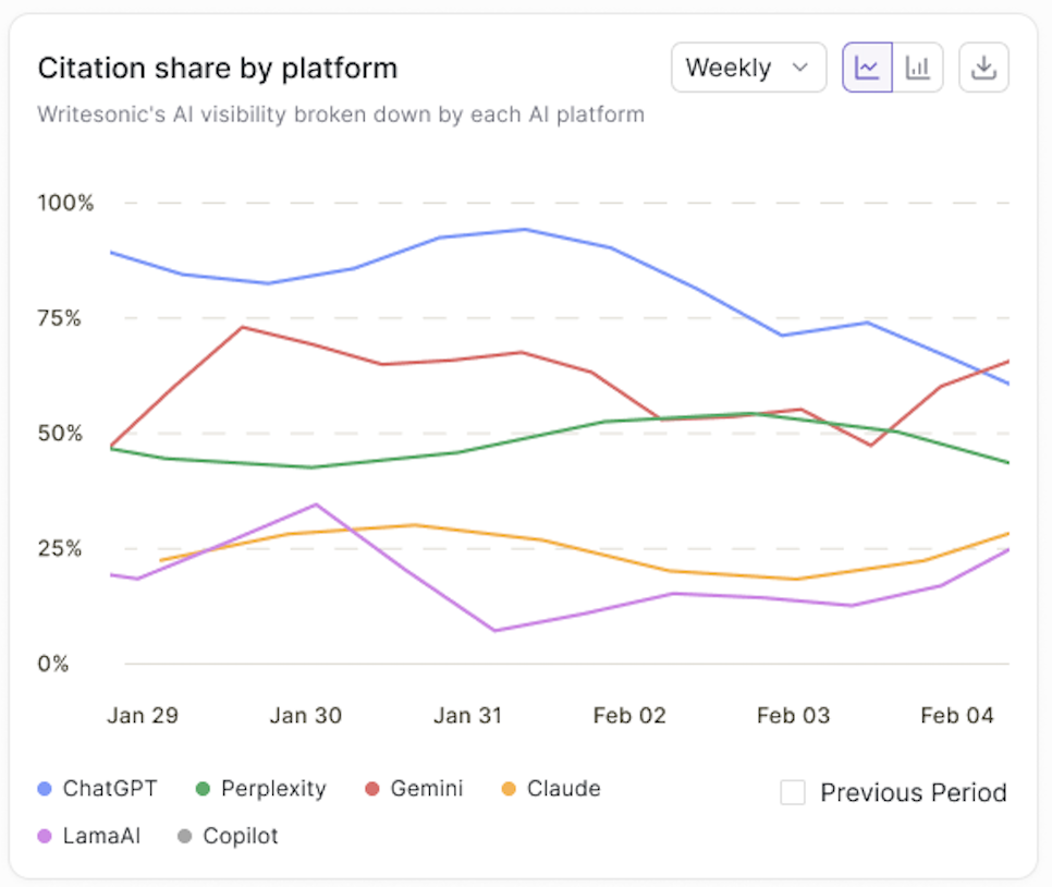 Similar to the AI visibility trend chart, this visualization tracks citation share — the percentage of AI responses that cite your website as a source — broken down by platform over time.