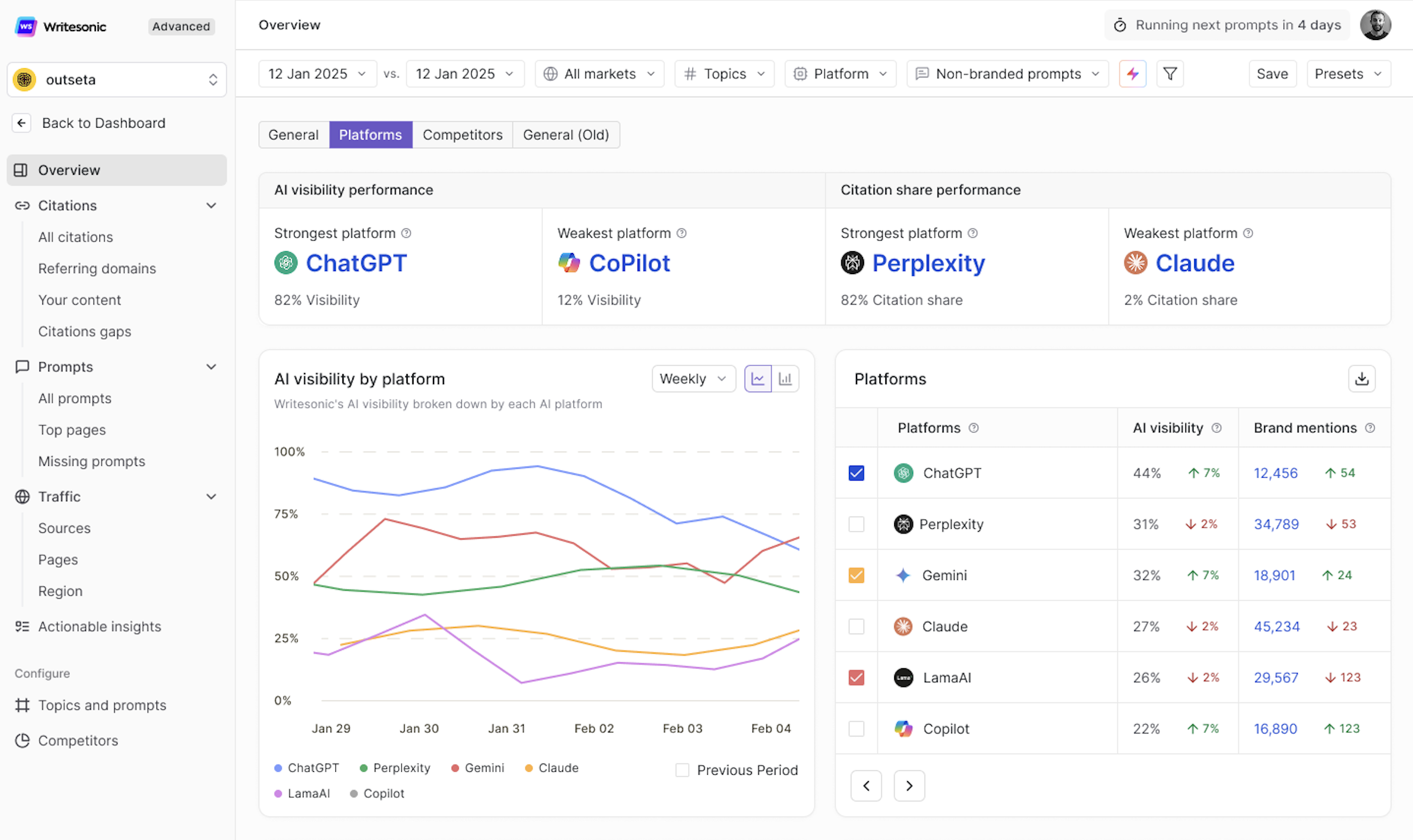 The Platforms tab within the Overview page gives you a detailed breakdown of how your brand performs across individual AI search platforms. While the General tab shows your overall AI visibility, the Platforms view lets you compare performance across engines like ChatGPT, Perplexity, Gemini, Claude, LamaAI, Copilot, and others — so you can see exactly where you're strong, where you're falling behind, and where the biggest opportunities lie.