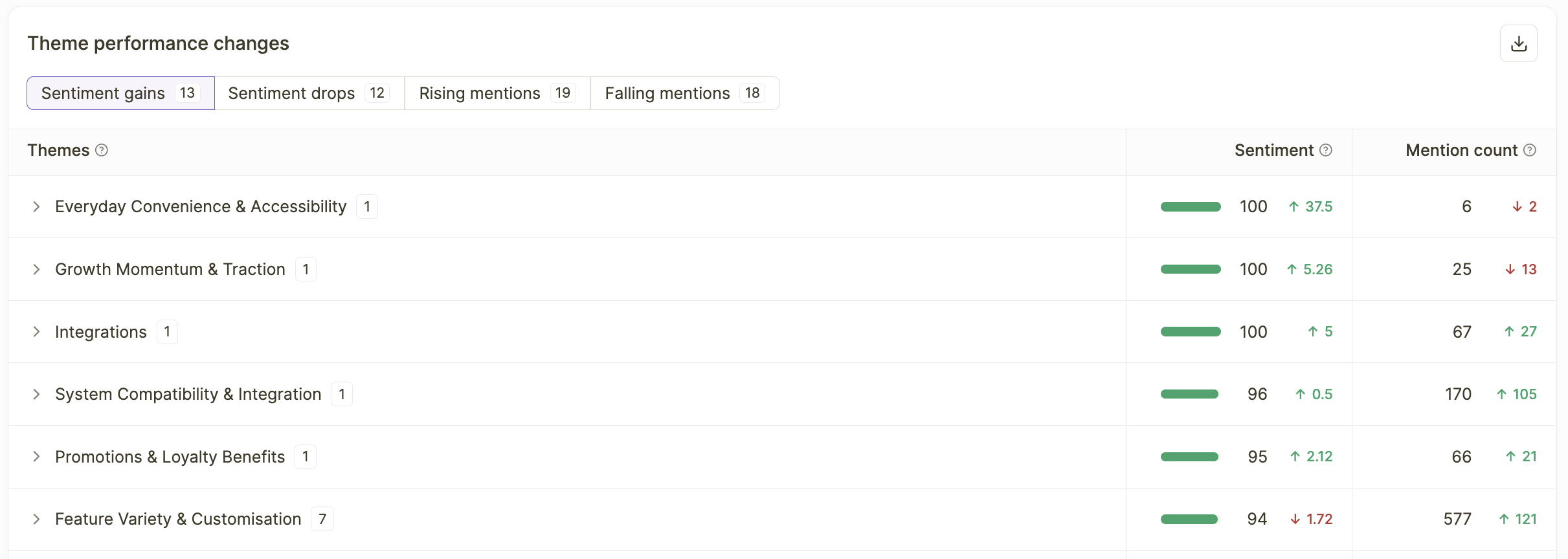 - Sentiment Gains — Themes where positive sentiment has increased compared to the previous period. These are your wins.