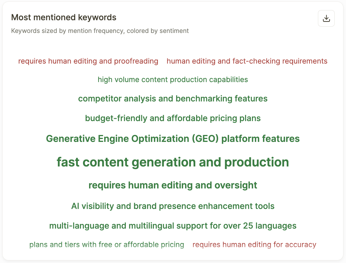A word cloud that visualizes the keywords most frequently associated with your brand across AI responses, sized by mention frequency and colored by sentiment.
