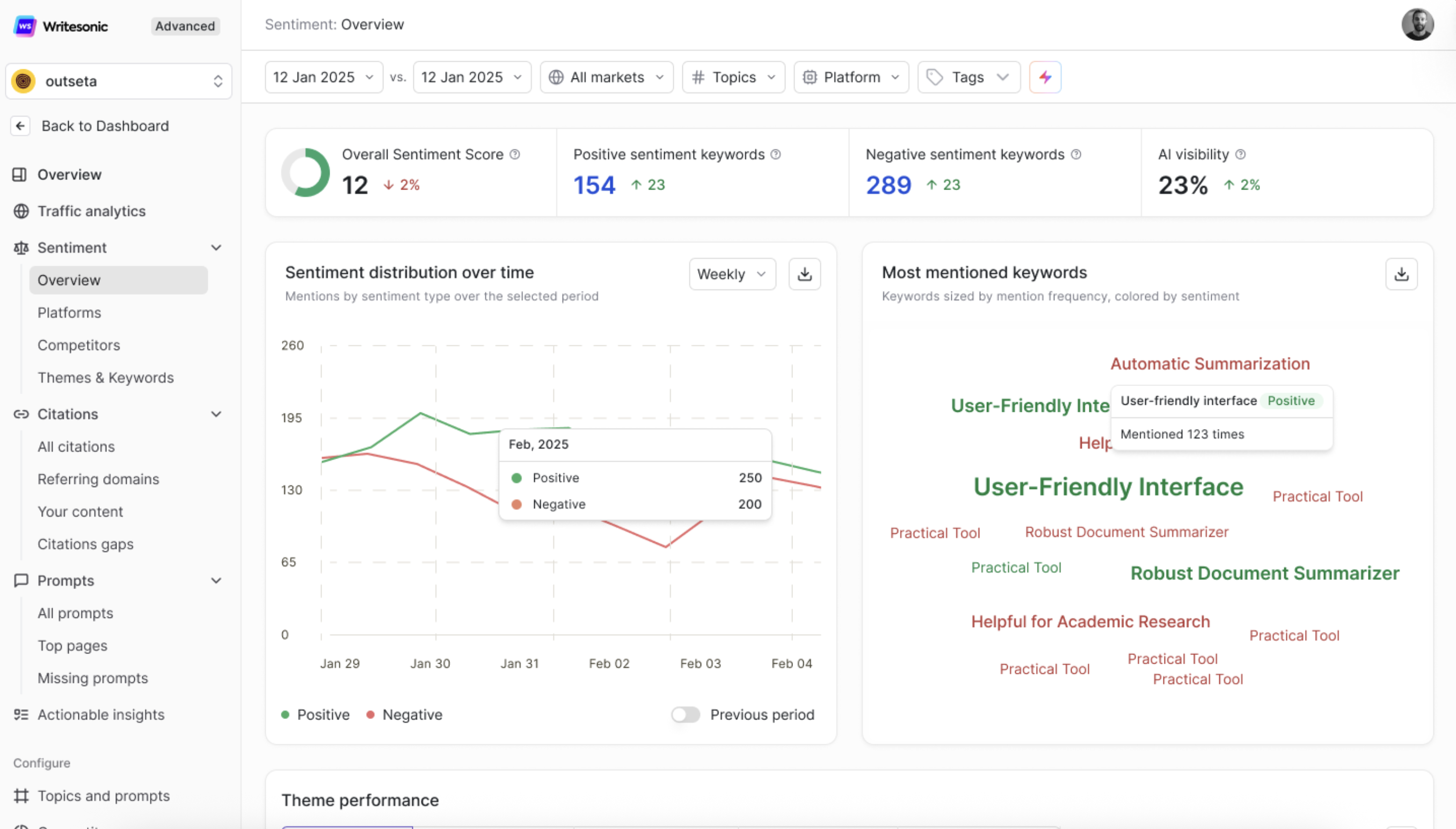 - Act on Theme Performance. The theme table is your most actionable tool. Use it to brief content teams, inform product messaging, and identify specific areas for improvement.