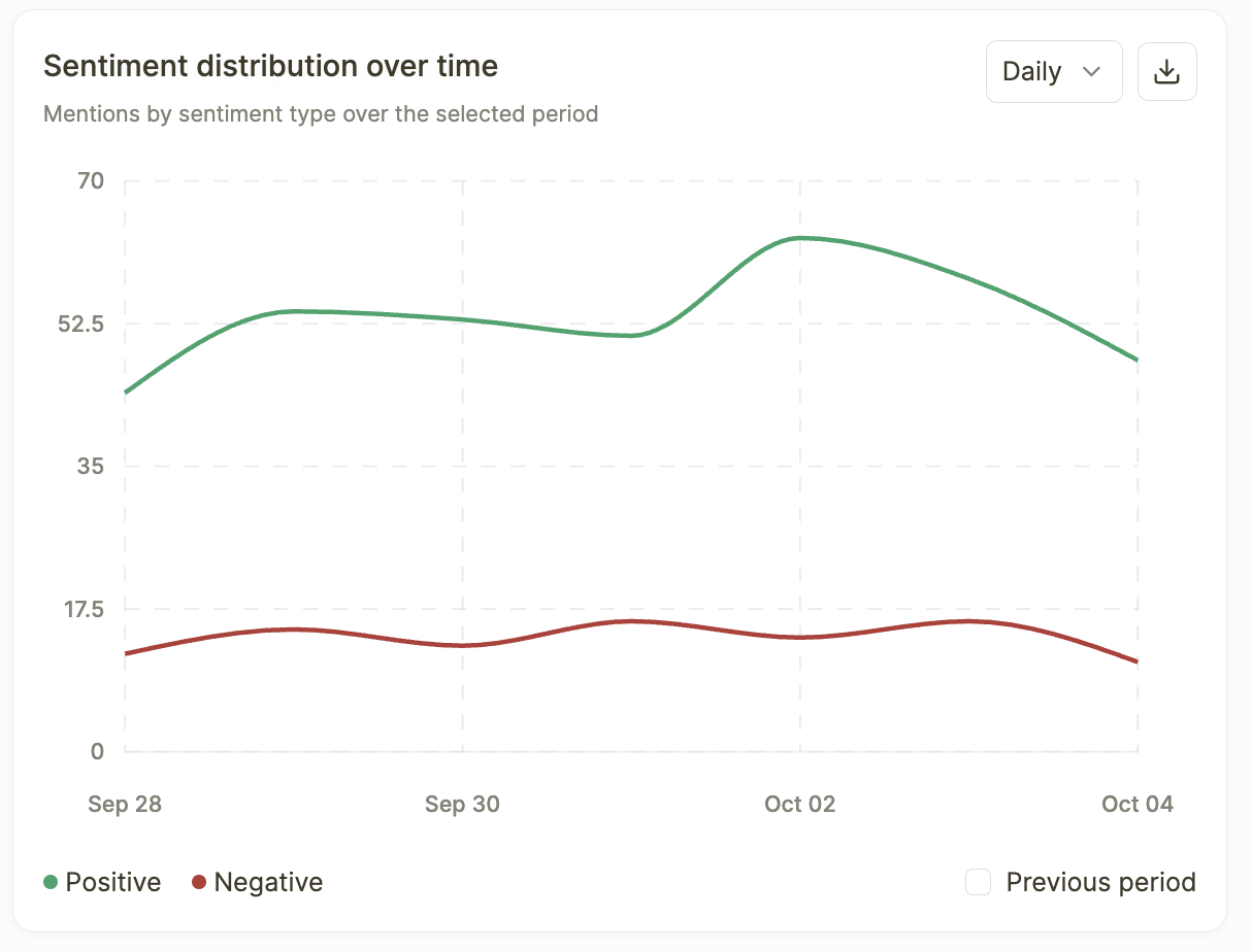 - Previous period comparison toggle — Enable this to overlay a prior time period and see how sentiment has improved or declined.