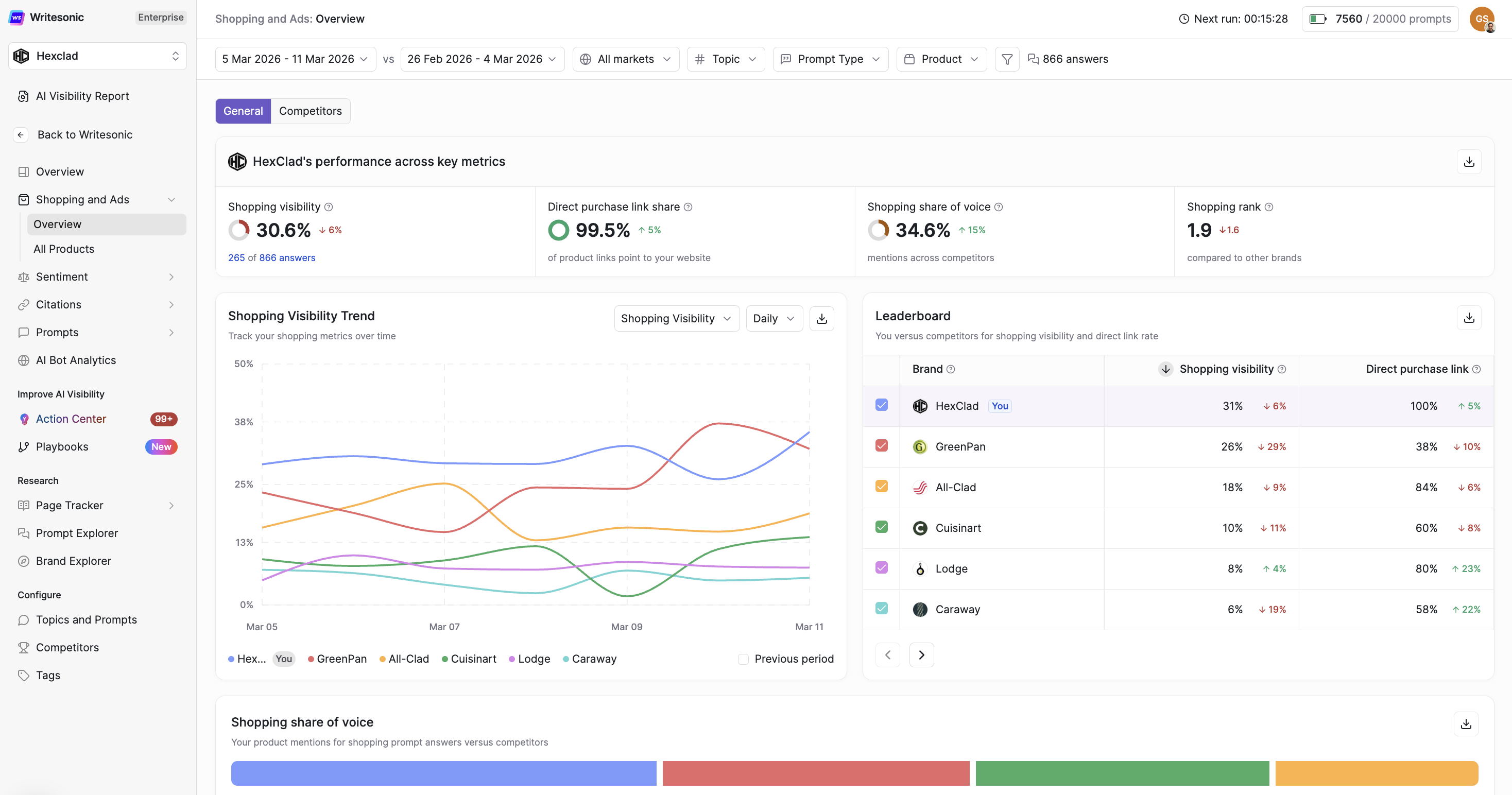 - Shopping Visibility — The brand’s overall shopping visibility percentage, with period-over-period change.