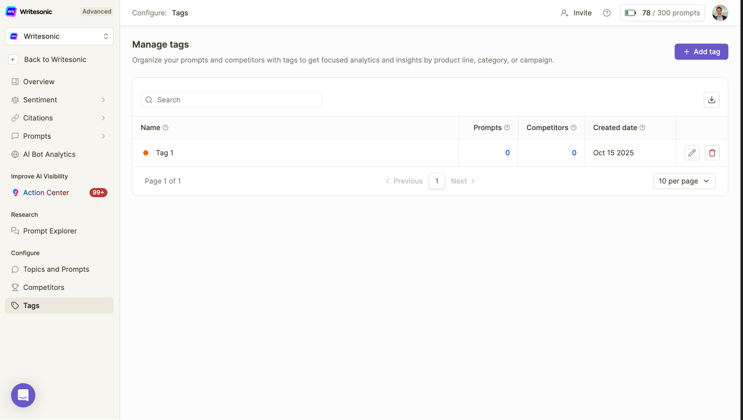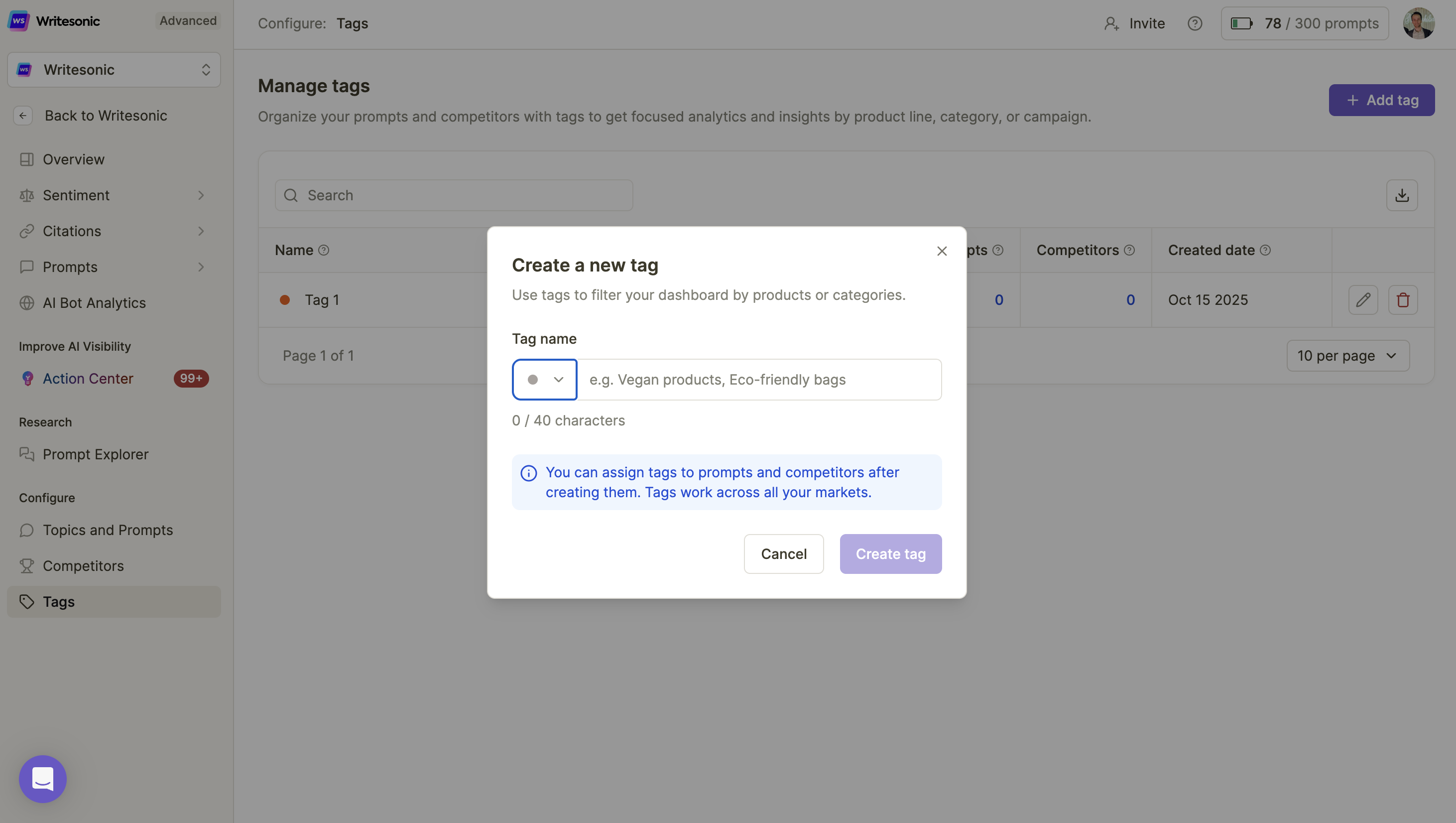 Tags are labels that help you categorize and track your AI search visibility by different dimensions like products, services, campaigns etc within Writesonic’s GEO platform. By tagging your prompts and competitors, you can gain focused AI Visibility insights into specific aspects of your organization.